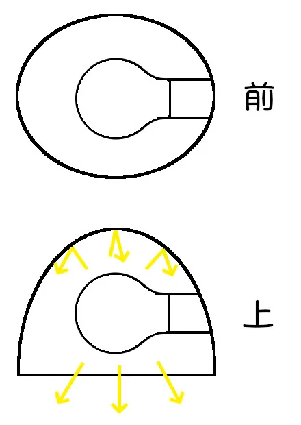 既成品のLEDでよく見るのは、バルブの真上にLEDが鎮座していて、真上方向に光が飛んでいくパターン。